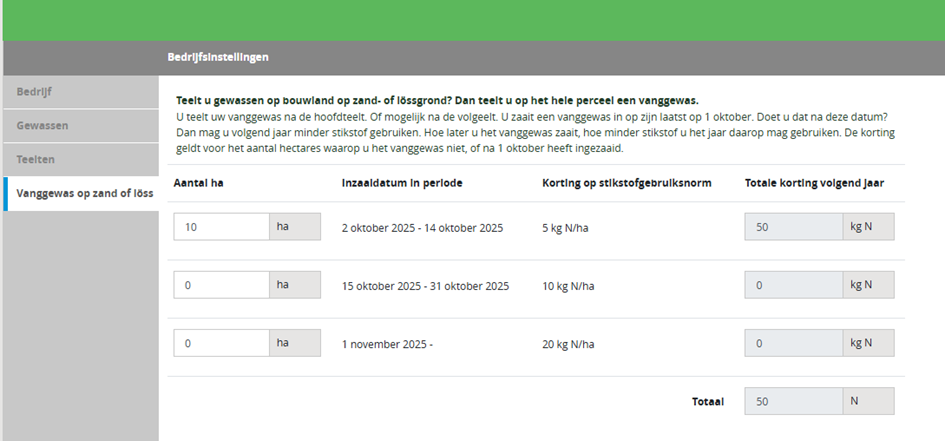 U teelt uw vanggewas na de hoofdteelt. Of mogelijk na de volgeelt. U zaait een vanggewas in op zijn laatst op 1 oktober. Doet u dat na deze datum? Dan mag u volgend jaar minder stikstof gebruiken. Hoe later u het vanggewas zaait, hoe minder stikstof u het jaar daarop mag gebruiken. De korting geldt voor het aantal hectares waarop u het vanggewas niet, of na 1 oktober heeft ingezaaid.