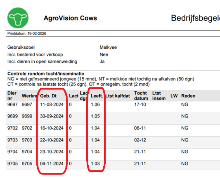 Op het overzicht Bedrijfsbegeleiding zijn de leeftijd en de geboortedatum van het jongvee toegevoegd.