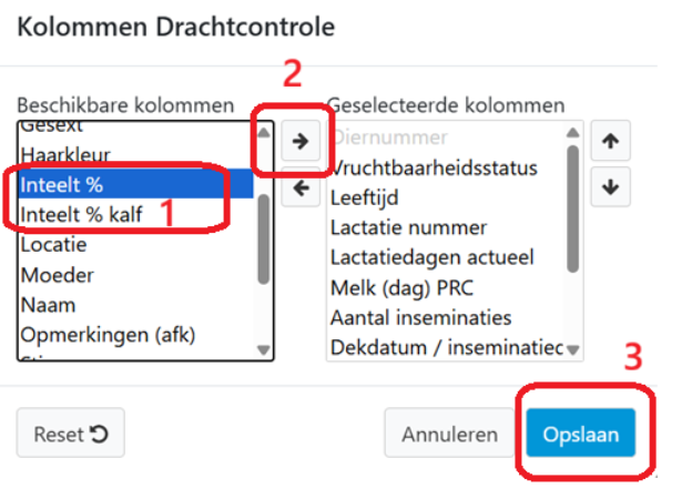 De inteeltpercentages kunnen op de invoer en attentielijsten voor inseminaties en drachtcontrole worden getoond, door deze te selecteren in de kolommen selectie.