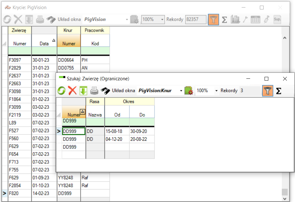 Wprowadzamy krycie i program nie akceptuje knura. Pojawia się okno jak poniżej:
