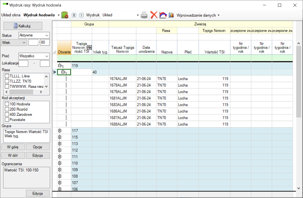 Wybieramy zwierzęta Aktywne w wieku od 0 do 80 tygodni. Ponieważ lista powinna zawierać zarówno loszki jak i knurki, wszystkie rasy i wszystkie kody akceptacji, wybieramy Wszystko w polu Płeć i zaznaczamy albo wszystkie pozycje albo żadną w polu Rasa oraz Kod akceptacji. - W polu Grupa wybieramy indeks jako priorytet. Drugim priorytetem jest wiek w tygodniach.