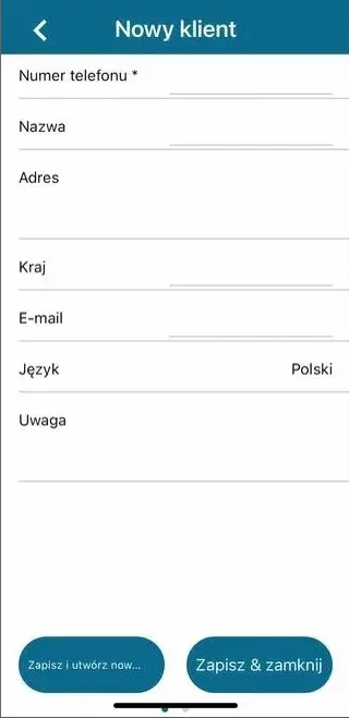 Gdy pojawi się pusta karta klienta i można zarejestrować nowego kontrahenta. Tylko numer telefonu jako dane kontaktowe jest obowiązkowy do synchronizacji z PigVision.