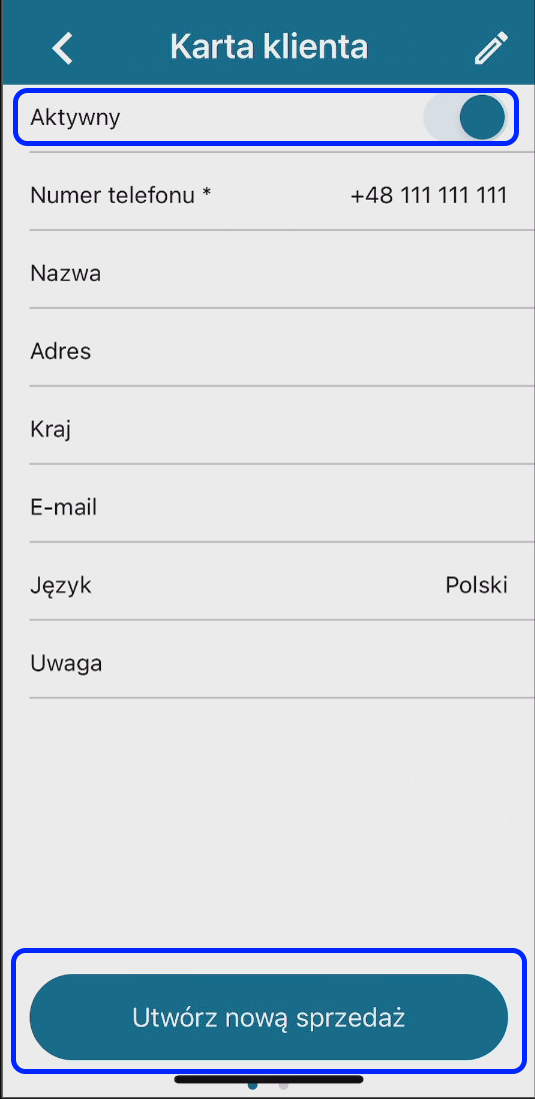 Kliknięcie ołówka w górnym rogu po prawej stronie, pozwala edytować dane kontaktowe. Można również uczynić klienta pasywnym, wówczas nie będzie on już dostępny do nowych sprzedaży.