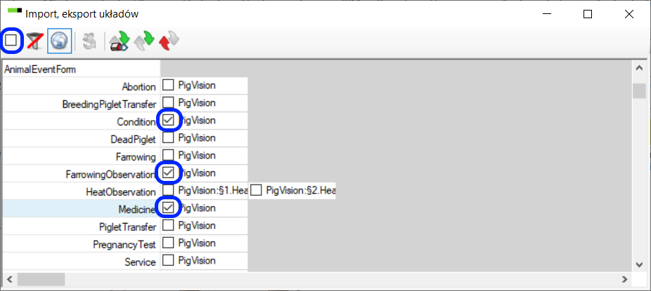 Oto wszystkie układy w PigVision. Po prawej stronie podano się menu, do którego dołączone są układy, np. Oproszenie. Usuwamy znacznik wyboru w prawym górnym rogu, aby odznaczyć wszystkie układy, a następnie zaznaczamy układ(y), które mają być wyeksportowane: