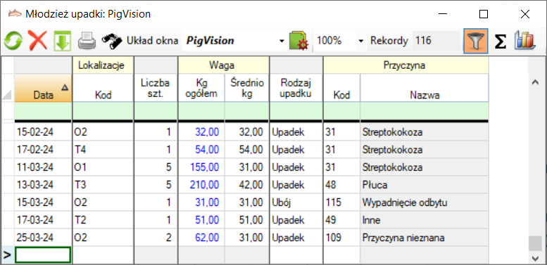 Wszystkie rosnące zwierzęta, tj. prosięta, warchlaki, tuczniki i loszki (bez przypisanego numeru) muszą zostać zarejestrowane w menu Młodzież – Upadki, jeśli padną lub zostaną poddane eutanazji.