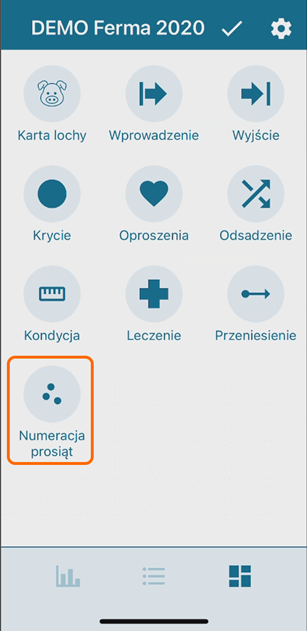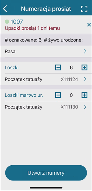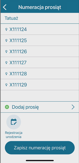 Aplikacja wyświetli oznakowane prosięta. Klikamy Zapisz numerację prosiąt.