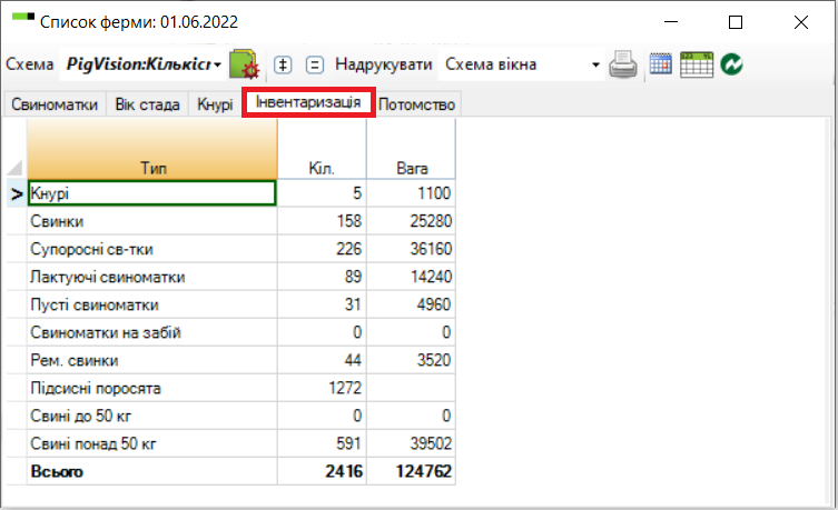Виберіть вкладку «Інвентаризація» (виділено червоним) та введіть в інвентаризацію кількість тварин вказавши правильну дату. (Інвентаризація знаходиться тут: «Св-тки/Кнурі» – «Інвентаризація»).