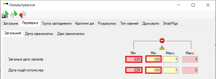 Якщо ви збираєтеся ввести дані по свиноматках чи по потомству за минулий період, поля «Мін.» слід виправити на -9999.